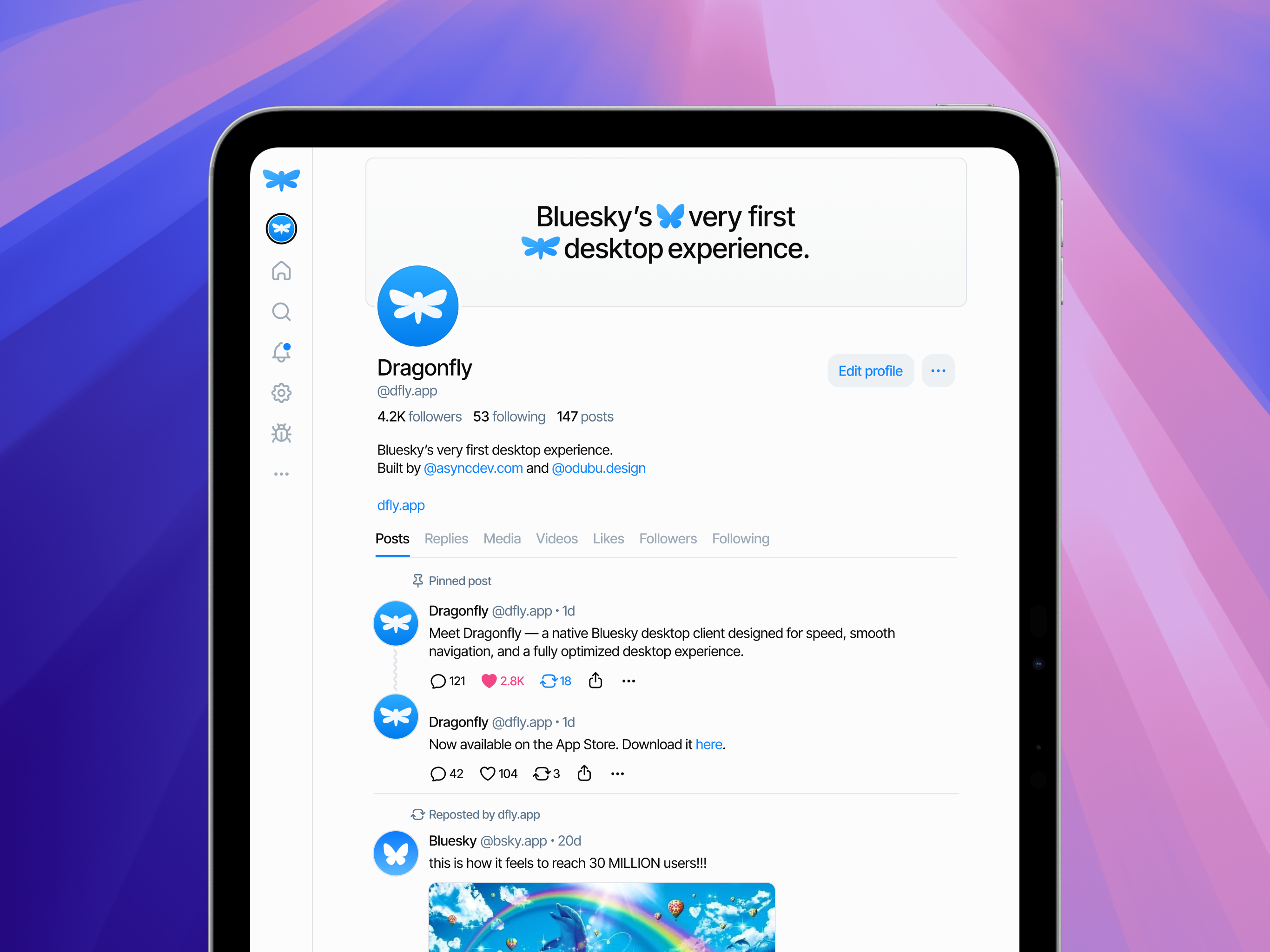Big news β Dragonfly is now available on iPad! Enjoy the same smooth, powerful Bluesky experience across your Apple devices.